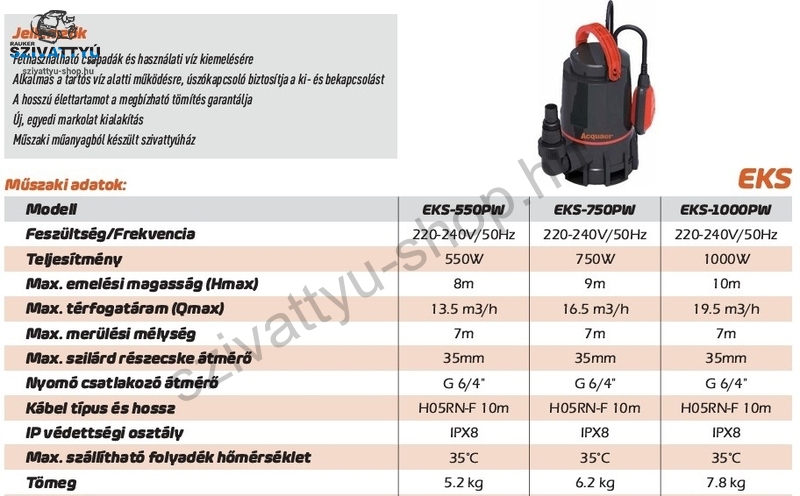Az ACQUAER EKS-1000PW 1000W-os motorral és műszaki műanyag házzal szerelt kerti merülő szivattyú, mely megbízható megoldást kínál tiszta víz mellett még szennyezőanyagot vagy lebegő részecskéket is tartalmazó víz szállítására. Fő felhasználási területük ásott kutak, tavak, elárasztott pincék, építési gödrök szennyezett vizének szivattyúzása. A merülő szivattyúkra általában jellemző, hogy nagy mennyiségű víz szállítására képesek, de ehhez csak kis nyomás társul, így pl. szórófejes öntözésre nem alkalmasak. A szivattyú egyszerű felépítésű és kényelmesen szállítható a rajta lévő hordozófogónak és könnyű súlyának köszönhetően. A terméket 10m kábellel szállítjuk és tartozéka még egy szabadon elfordítható 90° könyök, ami használatával elkerülhető a tömlő megtörése. A gyors beüzemelést segíti még egy a szokásos slag méretekhez illeszkedő univerzális tömlő csatlakozó is. A minél nagyobb vízszállítás elérése érdekében javasoljuk nyomó oldalon a nagyobb 1” (25mm) belső átmérőjű locsoló cső használatát. A szivattyú be/ki kapcsolását úszókapcsoló végzi, ami alacsony vízszintnél kikapcsol és véd a szárazon futás ellen, illetve emelkedő vízállásnál bekapcsolja és üzemben tartja a szivattyút. A be és kikapcsolási szintmagasság egyszerűen szabályozható az úszókapcsoló tartófülbe való befűzésével.