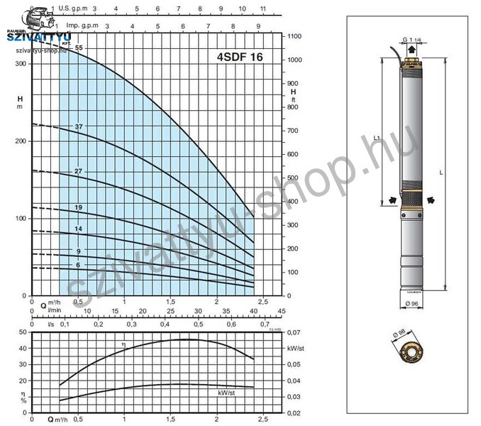 A Calpeda 4SDF 16/14EC búvárszivattyú gyártása során minden felhasznált alapanyag csak és kizárólag kiváló minőségű lehet, ez alapelv. Ennek köszönhetően a szivattyú hidraulika akár 300 g/m3 homoktűrő képességgel is rendelkezhet. A Calpeda 4 colos csőkút szivattyúkat előszeretettel használják lakóházak vízellátására, mezőgazdaságban gyümölcs és zöldség öntözéshez. A nagyobb emelőmagasságú és vízhozamú Calpeda 4SD szivattyúkat iparterületek vízellátására, tüzi víztározók biztonsági szivattyújának, de akár hidroglóbusz feltöltésére is alkalmasak. Mégis jellemzően fúrt kutakban alkalmazzák leggyakrabban. A minimum kútátmérő 110 mm. Nagyobb , hosszabb típusoknál fontos, hogy a kút egyenes legyen, és a perforációk ne akadályozzák a lehelyezést. Ebben az esetben inkább legyen 125 mm-es a kút átmérő. A Calpeda 4SDF 16/14EC búvárszivattyú motorja nem rendelkezik termikus hővédelemmel, ezért a biztonságos üzemeltetés érdekében érdemes megfelelő motorvédelemről gondoskodni. Erről ügyfélszolgálatunkon keresztül kaphat megfelelő segítséget.