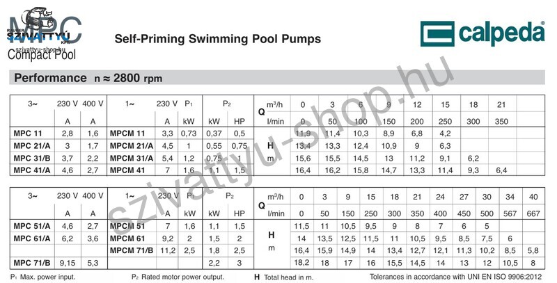A minőségi Calpeda MPCM 71/A medence vízforgató szivattyú nagy kapacitású átlátszó előszűrővel rendelkezik. Önfelszívó medence szivattyú beépített szűrővel. Szigetelt motor, ami nem érintkezik a vízzel. A szivattyúház kiváló minőségű üvegszál erősítésű norylból készül, mely