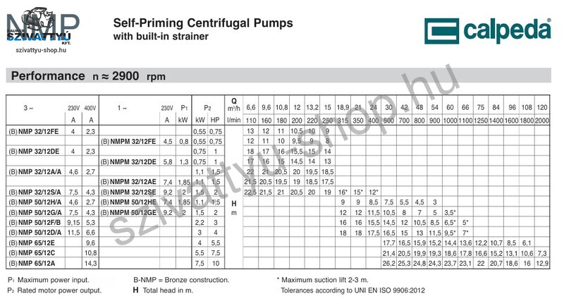 A kiváló minőségű Calpeda NMP 50/12H/A medence szivattyút folyamatos üzemre tervezték. Elsősorban medence vizének forgatására, mozgatására. A rendkívül erős szívóházban a maximális megengedett üzemi nyomás 6 bar. A Calpeda NMP 50/12H/A a megfelelő szűrőberendezéssel egybeépítve remek szolgálatot tesz a medencék vizének tisztán tartásában, mozgatásában. A Calpeda szivattyúkat számos területen alkalmazzák megbízhatóságuk és hosszú élettartamuk miatt. A Calpeda NMP 50/12H/A medence vízforgató szivattyú kiváló minőségű alapanyagok felhasználásával készül, melyek szavatolják a hosszú tartós üzemet. Ennek köszönhetően nem csak lakossági igényeket elégít ki. Kisebb tan medencék, wellness hotelek, szállodák is használják a Calpeda szivattyúkat. A szivóház és a szivattyú járókereke tartós és erős öntöttvasból készül, a motor tengely pedig AISI 303 rozsdamentes acélból. A motorteret kiváló minőségű karbon-kerámia-FPM tengelytömítés védi vízbehatolás ellen. A minőségi csapágyak a viszonylag halk üzemmódot garantálják. A Calpeda NMP 50/12H/A motorja háromfázisú 400V-os F szigetelésű, réz tekercselésű, IP 55 védettséggel. Ez a medence vízforgató szivattyú maximum +60 fokos vízhőmérsékletig használható. Szívó mélység maximum 7 méter. Szívó és nyomó oldali csatlakozás 2 1/2 coll belső menettel.