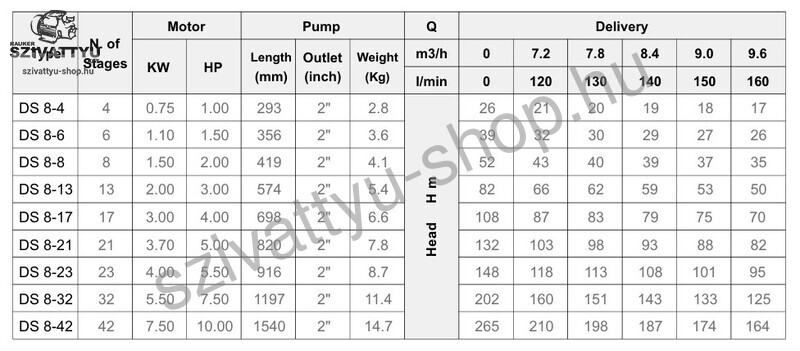A Dynatech DS 8-42 búvárszivattyú csőkút szivattyú magas minőségű alapanyagok felhasználásával készül a tartósság érdekében. Motorja olajhűtéses 400V-os háromfázisú. A gyári tápkábel hossza 2,7 méter. Kábelhosszabbítást természetesen vállalunk, erről ügyfélszolgálatunkon kaphat bővebb felvilágosítást.