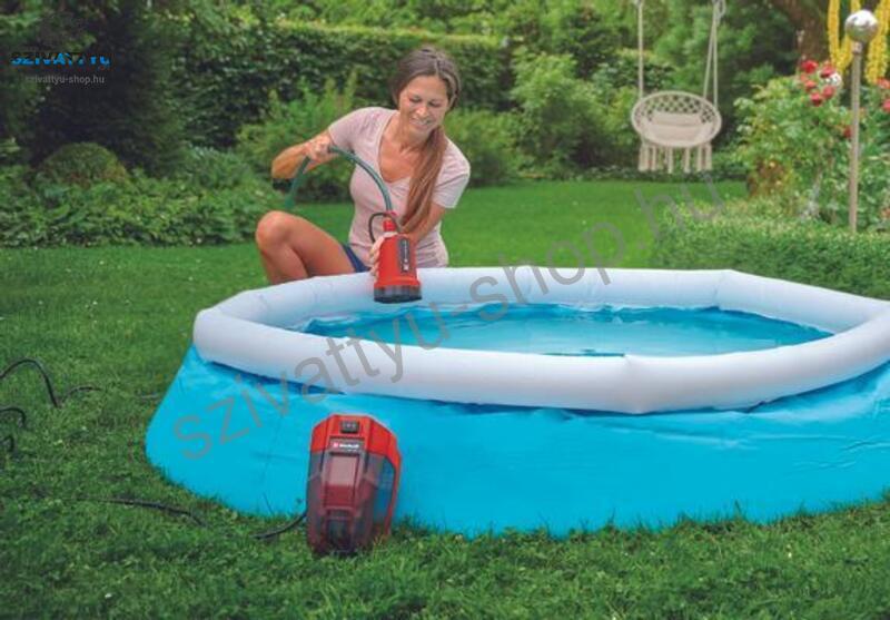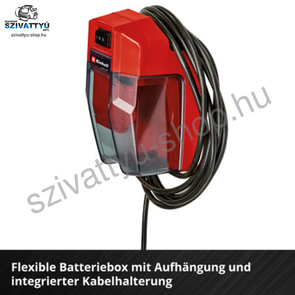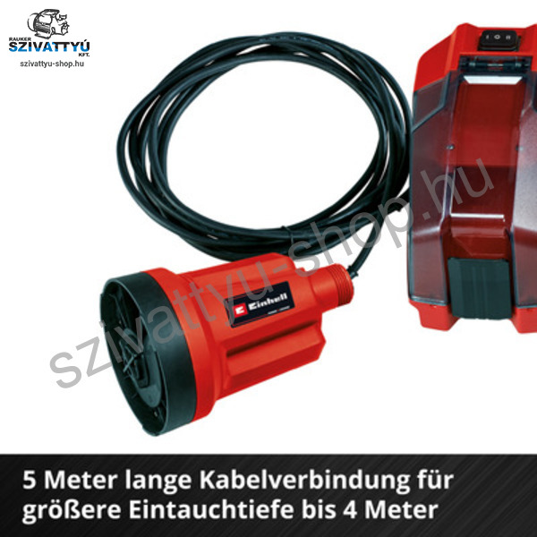 Az Einhell GE-SP 18 LL LI-KIT 4,0 akkus merülő szivattyú az áramforrástól függetlenül biztosítja a használhatóságot lítium-ion Power X-Change 18V-os külső akkumulátorral. Ez az akkumlátor család már több mint 250 Einhell akkus termékkel használható, kölönböző teljesítményekben. A GE-SP 18 LL LI-KIT 4,0 kifejezetten ideális a kertekben, medencék vizének ürítésére, de a kempingezés és a horgászat szerelmeseinek is ideális, hiszen könnyű és gyorsan egyszerűen üzembehelyezhező. Lakóépületen belüli gyors vízmentesítésre. A szivattyú 5 méter kábellel rendelkezik, amely a külső telepítésű akkumulátordobozban végződik. Az akkumulátor doboz nyitható és zárható plexije alatt kell behelyezni az akkumulátort. A fölötte található kapcsoló segítségével két állás I-II közüli kiválasztásával lehet bekapcsolni illetve leállítani a szivattyút. Praktikus rögzítő füllel is rendelkezik, így könnyedén rögzíthető, felakasztható.