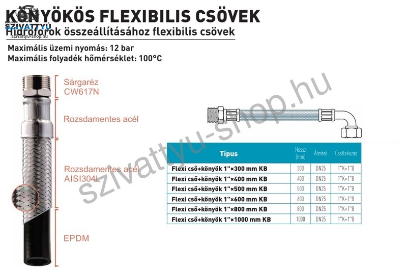 A Fixaflex Inox 1 coll KB könyökös 400 mm flexibiliscső ideális választás a szivattyú bekötésekhez, különösen az olyan helyeken, ahol szűk hely áll rendelkezésre. Kifejezetten előnyös a házivízellátó bekötésekhez, és a 90 fokos csatlakozásokhoz. A flexibiliscső belseje tartós és erős EPDM gumibevonatú, külső borítása tömlő fonata pedig rozsdamentes acél. A csatlakozások tartós sárgarézből készülnek. A csatlakozások közvetlen tövében található krimpelés is szintén rozsdamentes acélból készül. A Fixaflex Inox 1 coll KB könyökös 400 mm flexibiliscső maximum + 90 fokos hőmérsékletig és maximum 12 bar nyomásig használható.