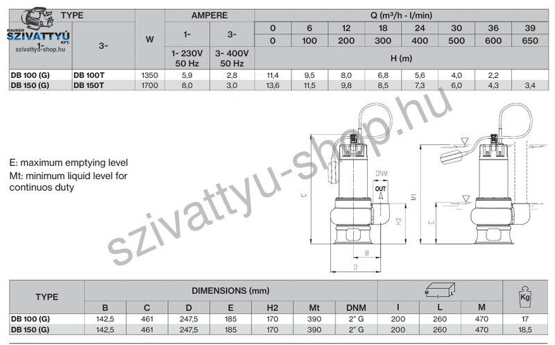 A Foras DB 150G szennyvízszivattyú a kétcsatornás járókeréknek köszönhetően a szennyvizet maximum 50 mm-es szennyeződésekkel képes szállítani. Ideális választás polgári és háztartási szennyvízelvezetéshez ahol szuszpendált anyagok lehetnek a szennyvízben. A Foras DB 150G szennyvízszivattyú kettős tengelytömítéssel rendelkezik. A szivattyú oldalon szilícium-karbid tömítés, a motor oldalon pedig kerámia-grafit tömítés található. A motor palást rozsdamentes acélból, az alatta található szivattyú örvényház öntöttvasból, a lábtartó szerkezet szintén rozsdamentes acélból készül. A kétcsatornás járókerék rozsdamentes acélból készül, mely tartós és erős. A motor tengely AISI 430 rozsdamentes acélból igen arős anyagból készül. A Foras DB 150G szennyvízszivattyút maximum +40 fokos folyadékhőmérsékletig lehet használni és fontos, hogy a meríthetősége maximum 5 méter. A gyári elektromos vezeték hossza 10 méter. A Foras DB 150G szabadátömlésű szennyvízszivattyú motorja F szigetelésű, IP 68 védettséggel. Nyomó csatlakozása függőleges 2 colos belső menettel. A megfelelő és tartós üzemeltetés érdekében érdemes ezen a méreten használni a szennyvízszivattyút. A gyári úszókapcsolónak köszönhetően a szivattyú atomata üzemmódban, fix telepítés mellett is használható. Az egyfázisú Foras DB 150G szennyvízszivattyú motorba integrált termikus hővédelemmel is rendelkezik.