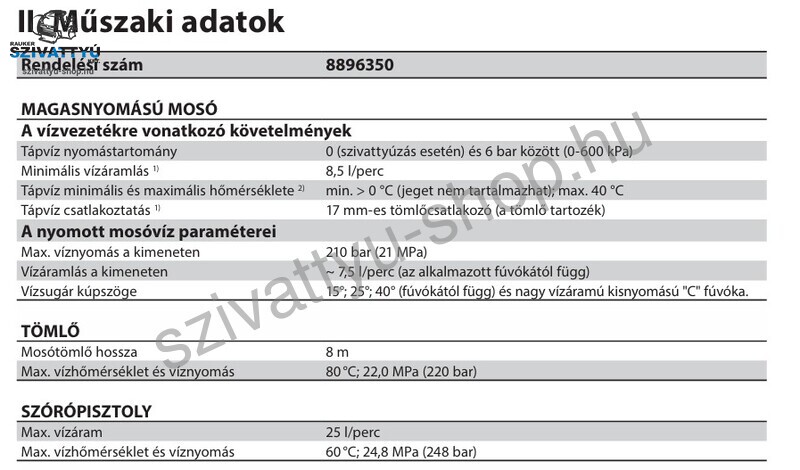 A Heron HPW 210 magasnyomású mosó legfontosabb műszaki paraméterei