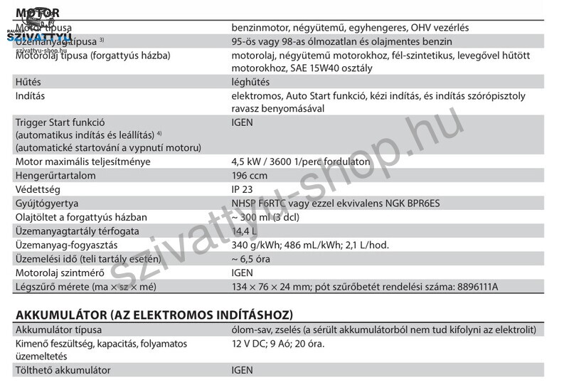 Motor: 4 ütemű, léghűtéses, OHV vezérlésű, olajszint érzékelővel ellátva