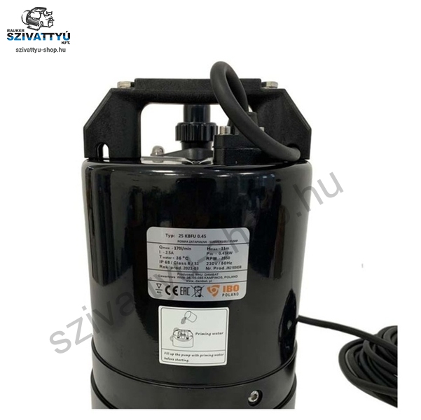 Az IBO 25-KBFU-0,45 merülő szivattyút professzionális felhasználásra, vízelvezetési feladatok ellátására tervezték. Leginkább az építkezéseken keletkező talajvizek elvezetésére használható. Az IBO KBFU szivattyúkat a masszív és tartós felépítés és a hosszú élettartam jellemzi és alkalmas homoktartalom mellett is a víz szivattyúzására. A köpenyhűtéses kialakítás biztosítja, hogy a szivattyú részleges merülés mellett is gond nélkül üzemeltethető. A felhasznált kiváló minőségű anyagok és a nagyon nagy teljesítmény miatt a KBFU szivattyúk alkalmasak nehéz körülmények között, például aknákban történő működésre. Kettős mechanikus tömítés biztosítja a tömítettséget, mely rendkívül jó kopásállósággal rendelkezik. Az IBO 25-KBFU-0,45 szivattyú lehetővé teszi a víz 3 mm szintre való leszivattyúzását. Az IBO KBFU sorozatú szivattyúk motorjai F osztályú tekercs szigeteléssel rendelkeznek, míg a használt csapágyak az japán NSK cégtől származnak.
