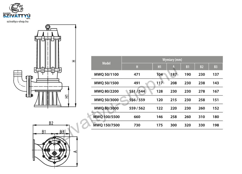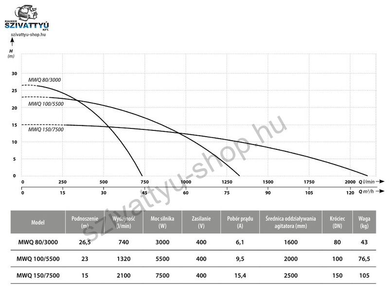 Professzionális IBO MWQ 80-3000-400 szennyvízszivattyú keverőrendszerrel, olyan ügyfelek számára, akiknek professzionális munkájuk során erős és megbízható termékre van szükségük. Ezeket a szivattyúkat széles körben használják szennyvízre, szivattyútelepeken. Az IBO MWQ szivattyúk nyers szennyvíz szivattyúzására szolgálnak olyan szivattyútelepekről, ahol sűrű iszap rakódhat le. A szivattyúk speciális kiegészítő külső rotorral (keverővel) rendelkeznek a nehéz iszap keverésére és felosztására. A felhasznált anyagok garantálják a hosszú távú és hibátlan működést. A motortengely anyaga rozsdamentes acél. A motorkamra kettős SiC/SiC mechanikus tömítéssel rendelkezik. A szivattyú többcsatornás járókereket használ a nagy átmérőjű szennyeződések szivattyúzására. Minden IBO MWQ szivattyú alkalmas vezetősín rendszerrel történő beépítésre. A motorok F osztályú tekercsszigeteléssel rendelkeznek, az egyfázisú változatok pedig a tekercsbe szerelt hővédelemmel is fel vannak szerelve. A szivattyúk a japán NSK által gyártott csapágyakkal rendelkeznek. Karimák a csövek csatlakoztatásához vagy gyorscsatlakozáshoz. A szivattyúk egyfázisú 230V ~/50Hz változatban és 3 fázisú 400V ~ 3/50Hz változatban is elérhetőek. A szivattyúk vezetősín rendszerekkel szállíthatók szivattyúállomásokba való beépítéshez. A vezetősín rendszer külön vásárolható meg.