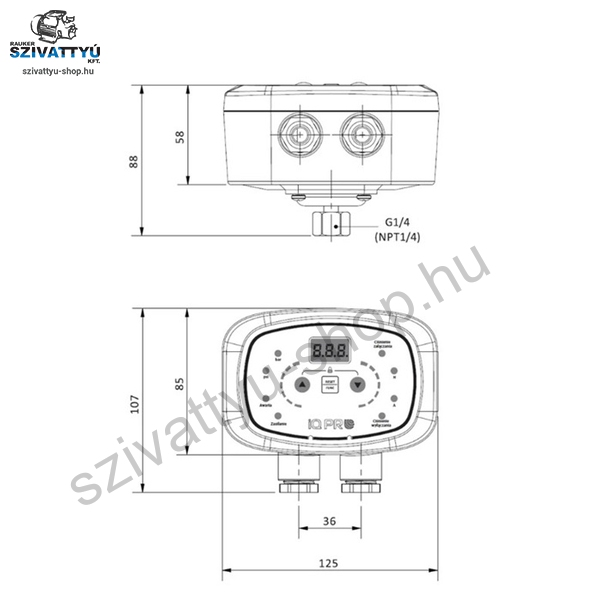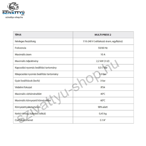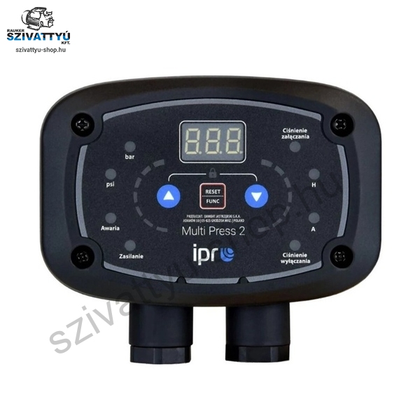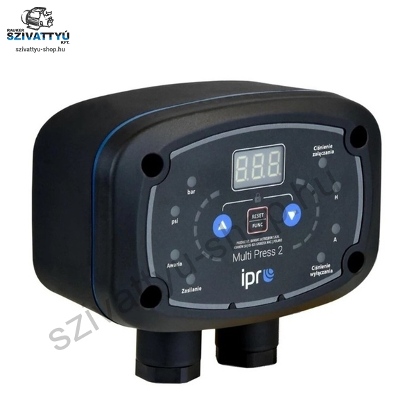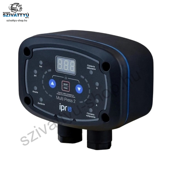Az IPRO IQ Multi PRESS egy elektronikus, digitális nyomáskapcsoló digitális kijelzővel, amely legfeljebb 2,2 kW teljesítményű egyfázisú szivattyúk indításának és leállításának vezérlésére használható 12A áramerősségig. A bekapcsolási és kikapcsolási nyomásértékek a vezérlőpanelen keresztül állíthatók be. A kényelmes és egyszerű kábelezésnek, valamint a külön szabályozható bekapcsolási és kikapcsolási nyomásértékeknek köszönhetően a készülék különféle felhasználói igényeket elégít ki. Használható egy szivattyú vezérlésére, vagy szinkronban egy másik vezérlővel segédszivattyú vezérlésére. A készülék megjeleníti az olyan paramétereket, mint a nyomás (bar vagy psi), az áramfelvétel (A), továbbá különböző védelmi funkciókkal is rendelkezik: túlterhelés, szárazonfutás, túl gyakori be-/kikapcsolás elleni védelem, szenzorhibák vagy magas rendszer-nyomás észlelése. A termékre 3 év gyári garanciát vállalunk.