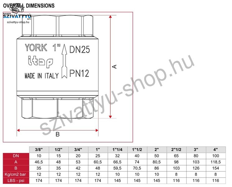 ITAP York visszacsapószelepek egyirányúak. Ez azt jelenti, hogy csak egy irányba engedik át a folyadékot, ezért szerelje fel úgy, hogy a testen lévő nyíl ugyanabban az irányban legyen, mint a folyadék áramlása. Az Itap York 5/4 coll visszacsapószelep teste, háza CW617N bronzból készül. A belsejében található rugó AISI 302 rozsdamentes acélból készül. A York visszacsapószelep tengelye és tányárja, valamint alátétje erős polimerből készül, a tányér alatti tömítés pedig NBR. Az Itap York 5/4 coll visszacsapószelep bármilyen pozícióban felszerelhető, belsőmenetes csatlakozással rendelkezik. Nyomástűrése 10 bar. Felhasználható vízellátó rendszerek, fűtési, légkondicionáló berendezések, esetében. Működési hőmérséklet tartomány: -20- +100°C