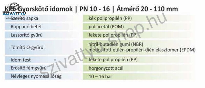 A KPE gyorskötő idomok kifejezetten a polietilén (PE) csövek csatlakozására lettek tervezve. Ezek a csatlakozók kompatibilisek az EN12201 szabványnak megfelelő PE80 és PE100 csövekkel. A termék lehetővé teszi a polietilén csövek gyors és biztonságos csatlakozását mind az iparban, mezőgazdaságban, vagy a házi felhasználás esetén is. Elérhető méretek webáruházunkban 25-32 mm átmérőig, maximális üzemi nyomás: 16 bar.
