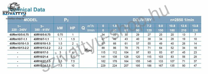 A Leo 4XR négy colos csőkút szivattyút búvárszivattyút elsősorban kisebb mezőgazdasági és ipari felhasználásra javasoljuk. A Leo 4XR 10/21-4 szivattyú gyári elektromos kábele 1,5 méter hosszúságú. Elektromos kábelhosszabbítás igénye esetén keresse ügyfélszolgálatunkat. Háromfázisú 400V-os motorral rendelkezik, hővédelem nélkül. Üzemeltetéséhez megfelelő motorvédelmet kell biztosítani. A Leo 4XR 10/21-4 búvárszivattyú csőkút szivattyú remek ár-érték arányú! 4 colos méretének köszönhetően 110, 125, 160 mm-es csőkútba is könnyedén és egyszerűen telepíthető. Motorteljesítménye P2 mindössze 4,0 KW. Homoktűrő képessége 150 g/m3.