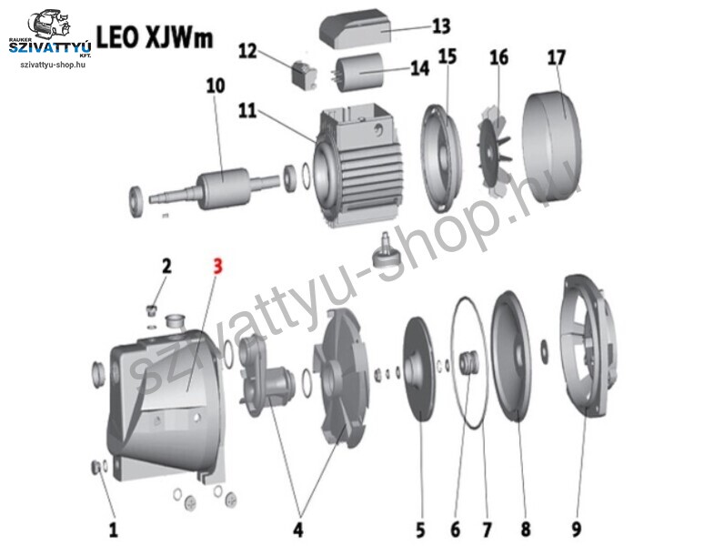A termékképen látható (3) számú Leo XJWm 90/46 szivattyú alkatrész. Ez a Leo szivattyú alkatrész a 2015-től gyártott Leo XJWm 90/46 szivattyúhoz használható!