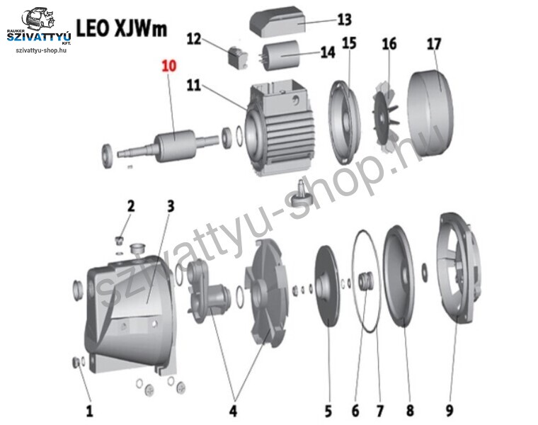 A termékképen látható (10) számú Leo XJWm 90/55 szivattyú alkatrész. Ez a Leo szivattyú alkatrész a 2015-től gyártott Leo XJWm 90/55 szivattyúhoz használható!