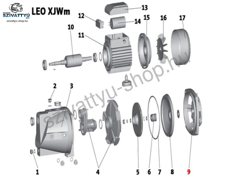 A termékképen látható (9) számú Leo XJWm 90/55 szivattyú alkatrész. Ez a Leo szivattyú alkatrész a 2015-től gyártott Leo XJWm 90/55 szivattyúhoz használható!
