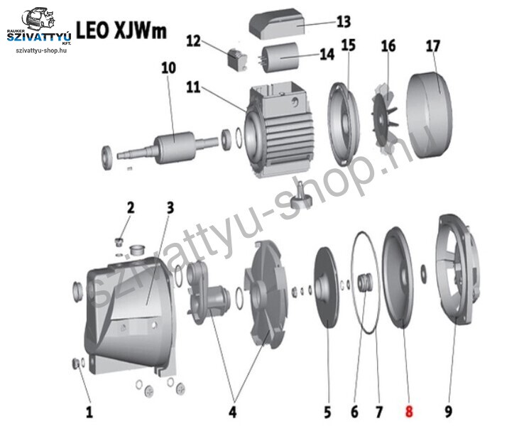 A termékképen látható (8) számú Leo XJWm 90/55 szivattyú alkatrész. Ez a Leo szivattyú alkatrész a 2014-ig gyártott Leo XJWm 90/55 szivattyúhoz használható!
