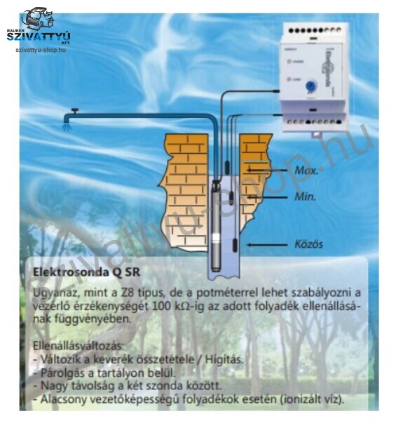 Az Elettrosonda MAC3 Q-SR egy sokrétű elektronikus szintszabályozó állítható ellenállással. A szabályzást a vezetőképes folyadékba lógatott 3 darab érzékelő szonda teszi lehetővé: egy minimum és egy maximum, ez a kettő között szabályozza a folyadékszintet, és egy közös szonda. A belógatott közegbe mindhárom szondát ellepi a folyadék, a készüléken belül a relék aktiválódnak, és akkor oldanak, ha az egyik érzékelő szonda szintjéről eltűnik a folyadék, töltésnek, vagy ürítésnek megfelelően. A MAC3 QS-R 230V 3 darab szondaérzékelővel együtt kerül kiszállításra.