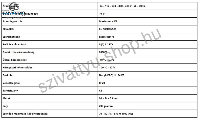 Az elektronikus szonda nem képes a szivattyú közvetlen vezérlésére a belső relé áramleadása miatt. Csatlakoztassa vezérlőszekrényre, vagy iktasson be egy mágneses relét a szivattyú és az elektronikus szonda csatlakozása közé.