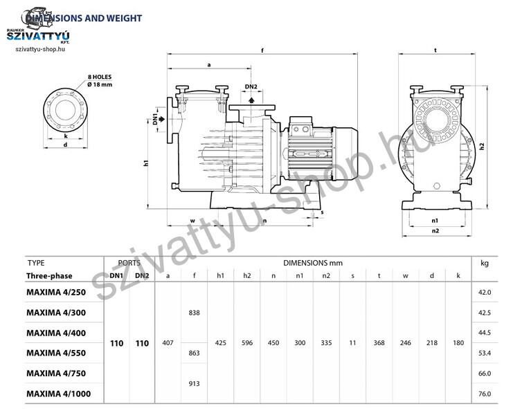 A Pedrollo Maxima-4 300 spanyol gyártású medence szivattyú a legkiválóbb minőségű alapanyagok felhasználásával készül, annak érdekében, hogy a lehető legtartósabb szivattyú legyen és hosszú évekig biztosítsa Önnek és medencéjének a vízforgatását. Önfelszívó centrifugális elektromos medence szivattyú előszűrővel, amely alkalmas nagyobb méretű medencék, hotelek, wellnes szállodák, uszodák, vizének keringetésére és szűrésére, különösen azok számára, amelyek nagy áramlási sebességet igényelnek (lefölözés). Kifejezetten nagy méretű közületi medencékhez ajánlott. Úszómedencékben használt vizek (pH 6,5 – 8,4). Enyhén sós vízre is használható medence szivattyú.