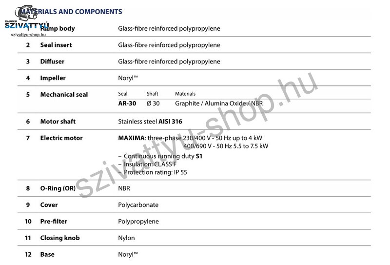 A Pedrollo Maxima-4 300 medence vízforgató szivattyú tartós, erős noryl járókerékkel készül, a motortengely pedig AISI 316 rozsdamentes acélból. Üvegszállal erősített polipropilén szívóházzal rendelkezik, mechanikus tömítése AISI 316 rozsdamentes acélból készül. Az előszűrő fedele pedig polikarbonátból. Az összeszereléshez AISI 304 rozsdamentes csavarok lettek felhasználva. A Pedrollo Maxima-4 300 medence szivattyú a legkorszerűbb IE3 motorokkal készül, természetesen réz tekercseléssel, F szigeteléssel. Védelmi besorolása: IP 55. Igény esetén ez a medence szivattyú rendelhető bronz járókerékkel is.