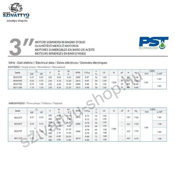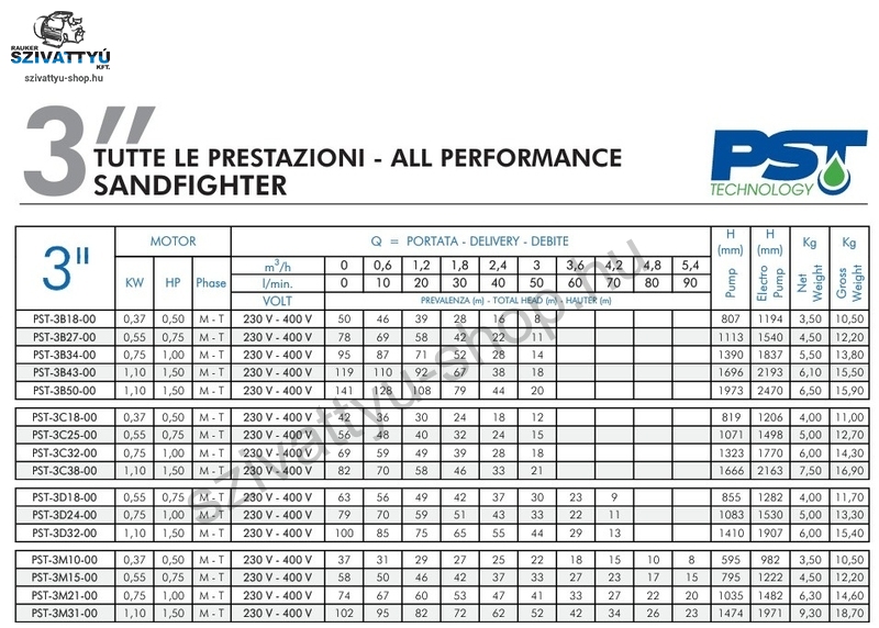 Olasz gyártmányú 3” coll átmérőjú, többfokozatú PST SANDFIGHTER 3M10 csőkút szivattyú minimum DN80 átmérőjű kutakba tervezve, kiemelkedő - 800g/m3 homoktűréssel. A szivattyú magas minőségű anyagok alkalmazásával készül (AISI 304 és AISI 316 rozsdamentes acél, homoktűrő technopolimer, sárgaréz kombinációval). A berendezések telepíthetőek függőlegesen és vízszintesen (18 járókerékig) is. A berendezések gyárilag beépített (igény szerint leszerelhető) visszacsapó szeleppel kerülnek kiszállításra, a tápkábel hossza 1,5m (kérésre az igényelt hosszra toldjuk a vonatkozó műszaki irányelveknek megfelelően). A 230V - os szivattyúk külső vezérlő doboza (kondenzátor, hőkioldó) nem alap tartozék. Ez külön megvásárolható webáruházunkban. Indítódobozok: ITT!