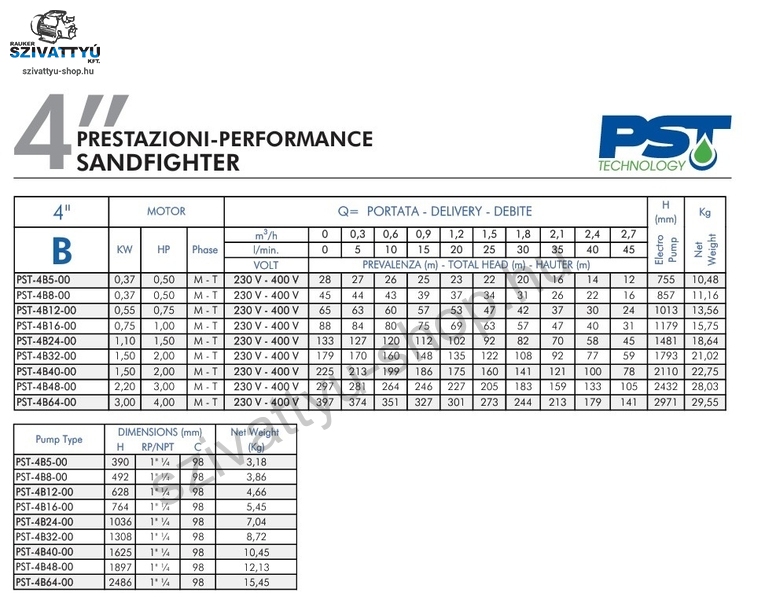 Olasz gyártmányú 4 coll átmérőjú, többfokozatú PST SANDFIGHTER 4B40 csőkút szivattyú minimum DN110 átmérőjű kutakba tervezve, kiemelkedő, 800g/m3 homoktűréssel. A szivattyú magas minőségű anyagok alkalmazásával készül (AISI 304 és AISI 316 rozsdamentes acél, homoktűrő technopolimer, sárgaréz kombinációval). A berendezések telepíthetőek függőlegesen és vízszintesen (18 járókerékig) is. A berendezések gyárilag beépített (igény szerint leszerelhető) visszacsapó szeleppel kerülnek kiszállításra, a tápkábel hossza 1,5m (kérésre az igényelt hosszra toldjuk a vonatkozó műszaki irányelveknek megfelelően). A 230V - os szivattyúk külső vezérlő doboza (kondenzátor, hőkioldó) nem alap tartozék. Ez külön megvásárolható webáruházunkban. Indítódobozok: ITT!