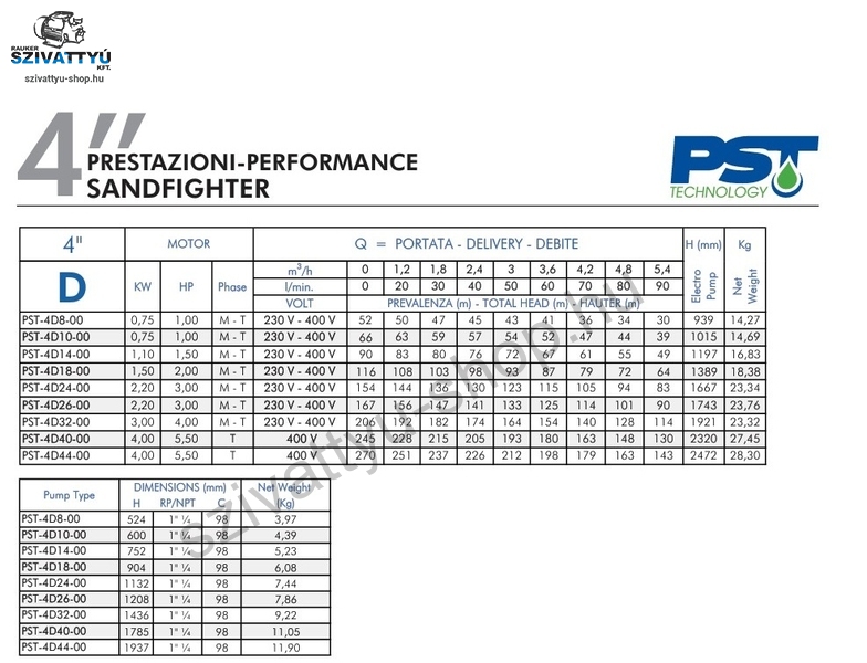 Olasz gyártmányú 4 coll átmérőjú, többfokozatú PST SANDFIGHTER 4D14 csőkút szivattyú minimum DN110 átmérőjű kutakba tervezve, kiemelkedő, 800g/m3 homoktűréssel. A szivattyú magas minőségű anyagok alkalmazásával készül (AISI 304 és AISI 316 rozsdamentes acél, homoktűrő technopolimer, sárgaréz kombinációval). A berendezések telepíthetőek függőlegesen és vízszintesen (18 járókerékig) is. A berendezések gyárilag beépített (igény szerint leszerelhető) visszacsapó szeleppel kerülnek kiszállításra, a tápkábel hossza 1,5m (kérésre az igényelt hosszra toldjuk a vonatkozó műszaki irányelveknek megfelelően). A 230V - os szivattyúk külső vezérlő doboza (kondenzátor, hőkioldó) nem alap tartozék. Ez külön megvásárolható webáruházunkban. Indítódobozok: ITT!