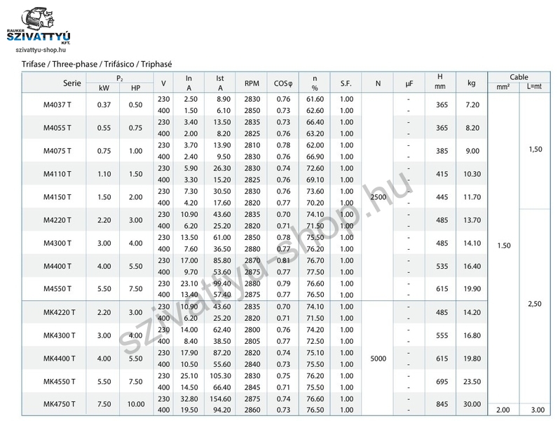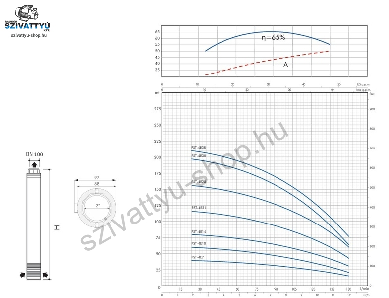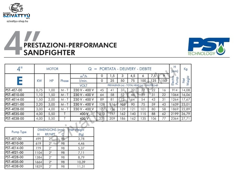 Olasz gyártmányú 4 coll átmérőjú, többfokozatú PST SANDFIGHTER 4E35-T csőkút szivattyú minimum DN110 átmérőjű kutakba tervezve, kiemelkedő, 800g/m3 homoktűréssel. A szivattyú magas minőségű anyagok alkalmazásával készül (AISI 304 és AISI 316 rozsdamentes acél, homoktűrő technopolimer, sárgaréz kombinációval). A berendezések telepíthetőek függőlegesen és vízszintesen (18 járókerékig) is. A berendezések gyárilag beépített (igény szerint leszerelhető) visszacsapó szeleppel kerülnek kiszállításra, a tápkábel hossza 1,5m (kérésre az igényelt hosszra toldjuk a vonatkozó műszaki irányelveknek megfelelően). A 400V - os szivattyúk megfelelő motor védelméről minden esetben gondoskodni kell!