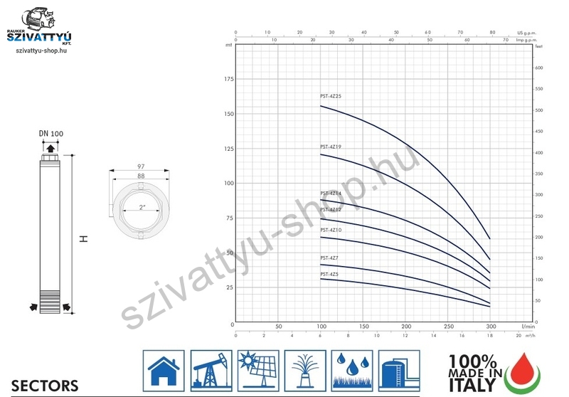 Olasz gyártmányú 4 coll átmérőjú, többfokozatú PST SANDFIGHTER 4Z19-T csőkút szivattyú minimum DN110 átmérőjű kutakba tervezve, kiemelkedő, 800g/m3 homoktűréssel. A szivattyú magas minőségű anyagok alkalmazásával készül (AISI 304 és AISI 316 rozsdamentes acél, homoktűrő technopolimer, sárgaréz kombinációval). A berendezések telepíthetőek függőlegesen és vízszintesen (18 járókerékig) is. A berendezések gyárilag beépített (igény szerint leszerelhető) visszacsapó szeleppel kerülnek kiszállításra, a tápkábel hossza 1,5m (kérésre az igényelt hosszra toldjuk a vonatkozó műszaki irányelveknek megfelelően). A 400V - os szivattyúk megfelelő motor védelméről minden esetben gondoskodni kell!
